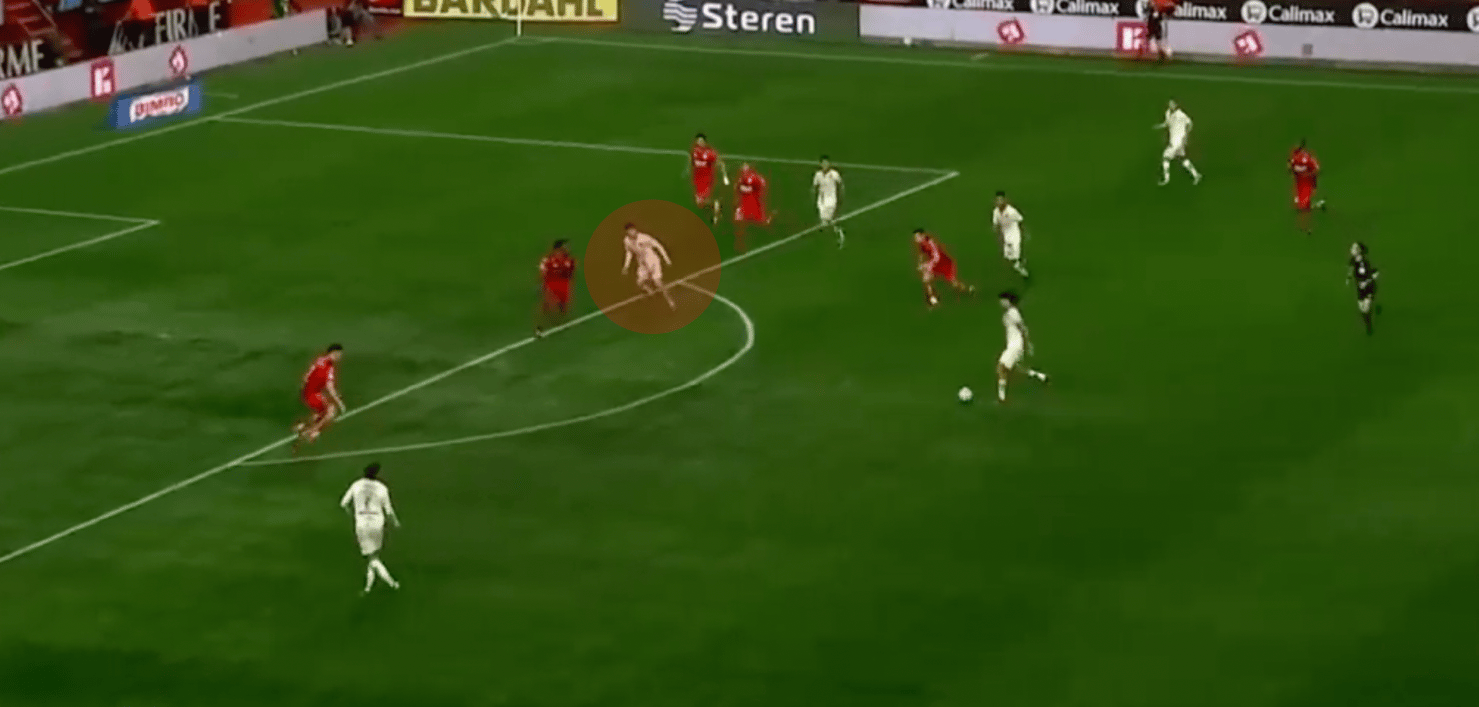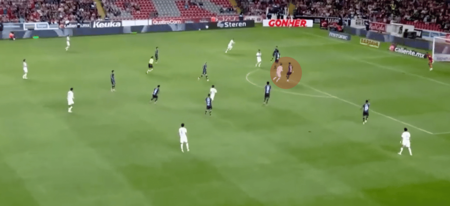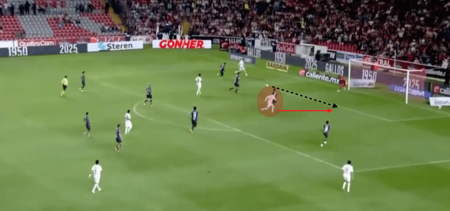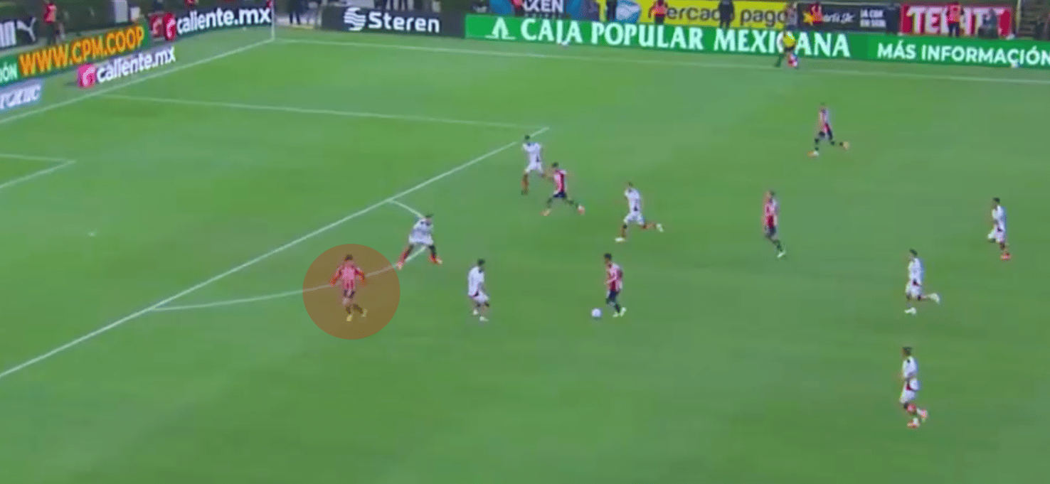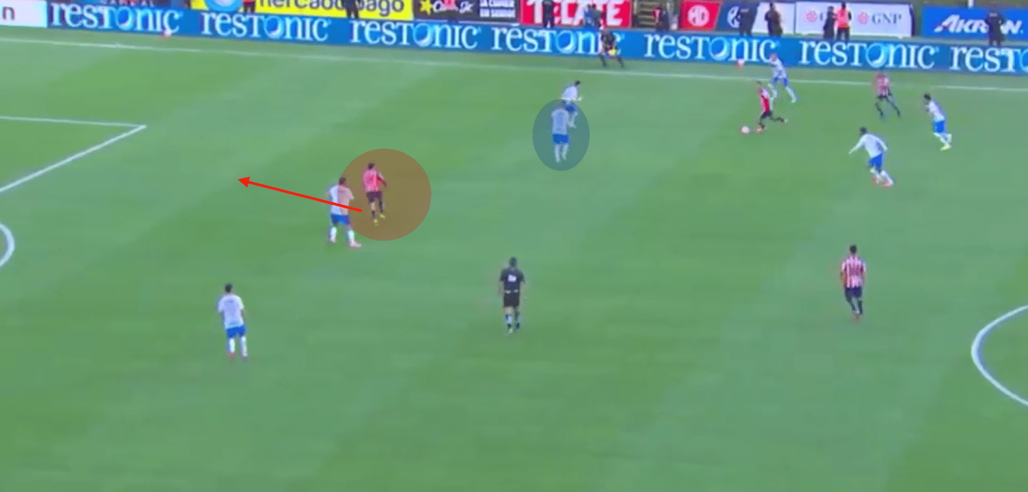 Un ejemplo similar en un partido contra Pachuca, Hormiga se ha movido por fuera para explotar espacio dejado por un lateral, que había avanzado con posesión.