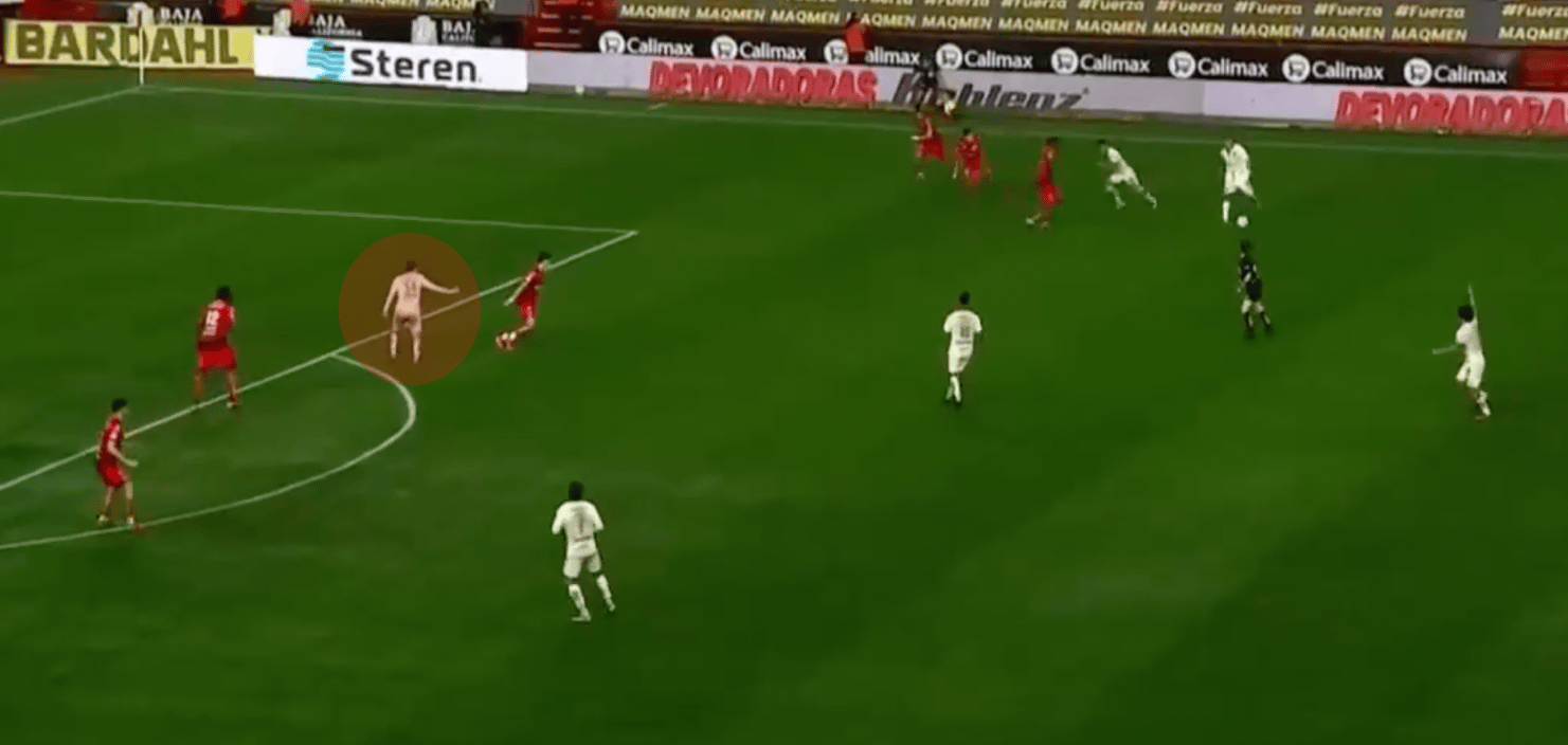 Ambos ejemplos muestran una orientación de su cuerpo eficiente, facilitando aceleración rápida hacia el espacio, pero el mejor ejemplo viene del partido contra Tijuana.