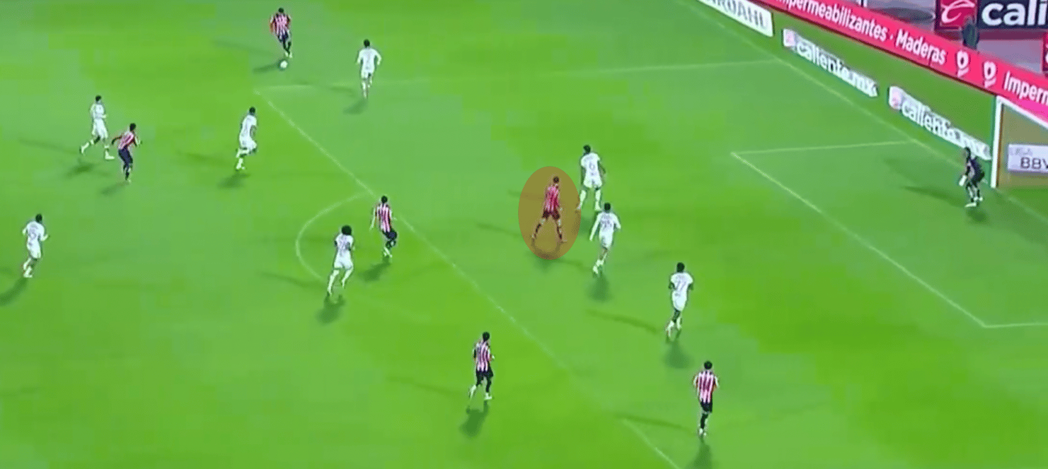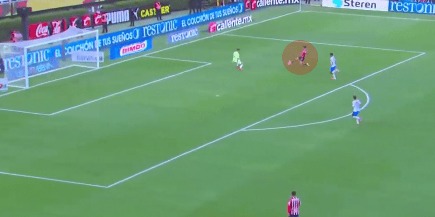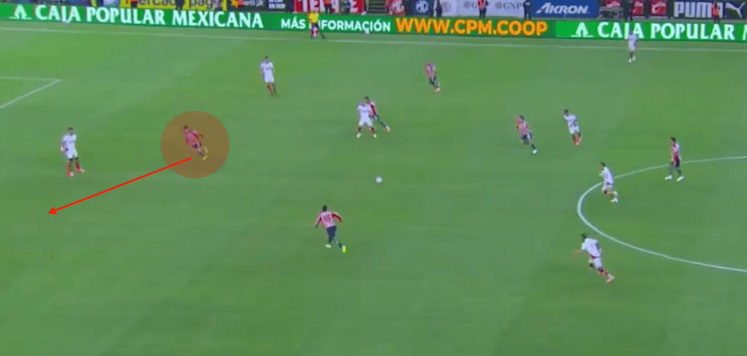 Aqui contra Tigres por ejemplo. Hormiga ataca la espalda de Joaquim, que parece más enfocado en el jugador de Chivas entre líneas, y esta mal perfilado, entonces tiene que girar antes de acelerar hacia su portería. Hormiga también curvea su desmarque, para reducir la posibilidad de estar en una posición fuera de lugar.