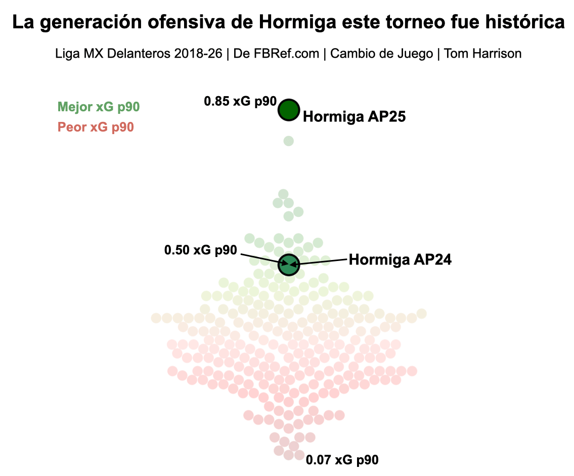Hormiga sumó 0.85 xG por 90 minutos en Apertura 25, la mejor calificación de cualquier jugador en Liga MX, tras 2018. Mejor que cualquier torneo de André-Pierre Gignac, Paulinho o Santi Giménez.