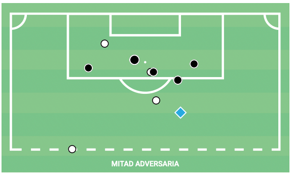 El mapa muestra sus regates en el último tercio, con los puntos negros resultando en un tiro tras el 1vs1 ofensivo. El diamante azul fue un regate seguido por un gol de Hormiga.