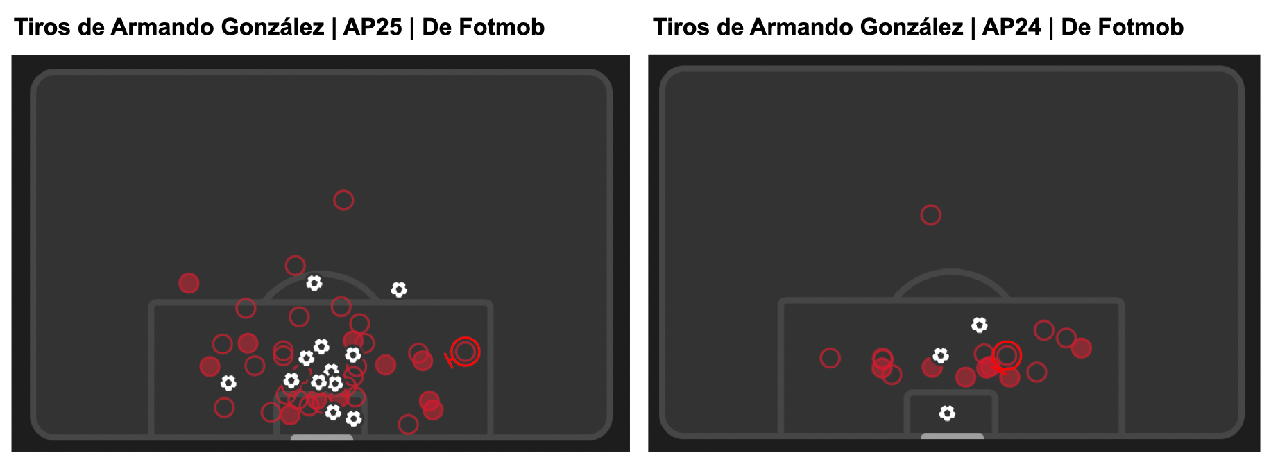 La cantidad de tiros generados de González en las posiciones más peligrosas es extraordinario. El mapa de Fotmob muestra muchos disparos desde más cerca de la portería que el manchón penal.