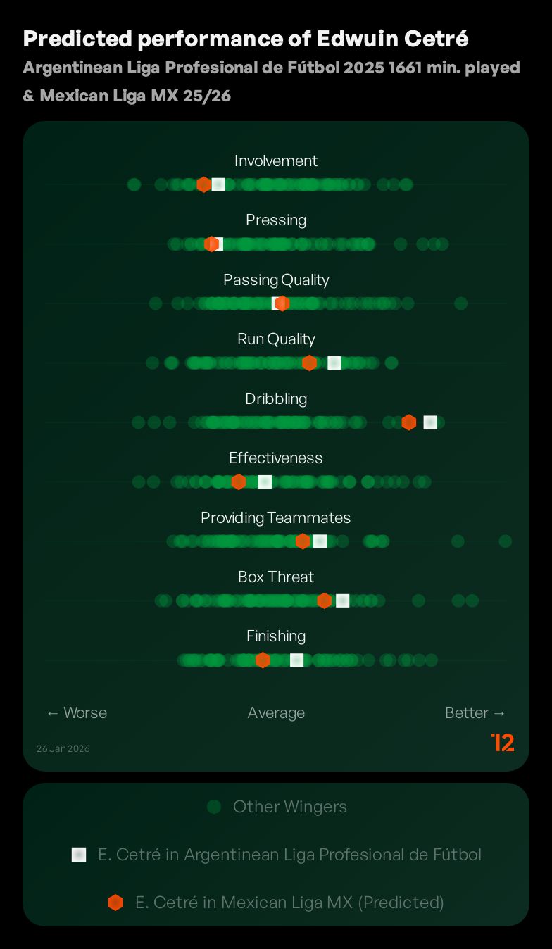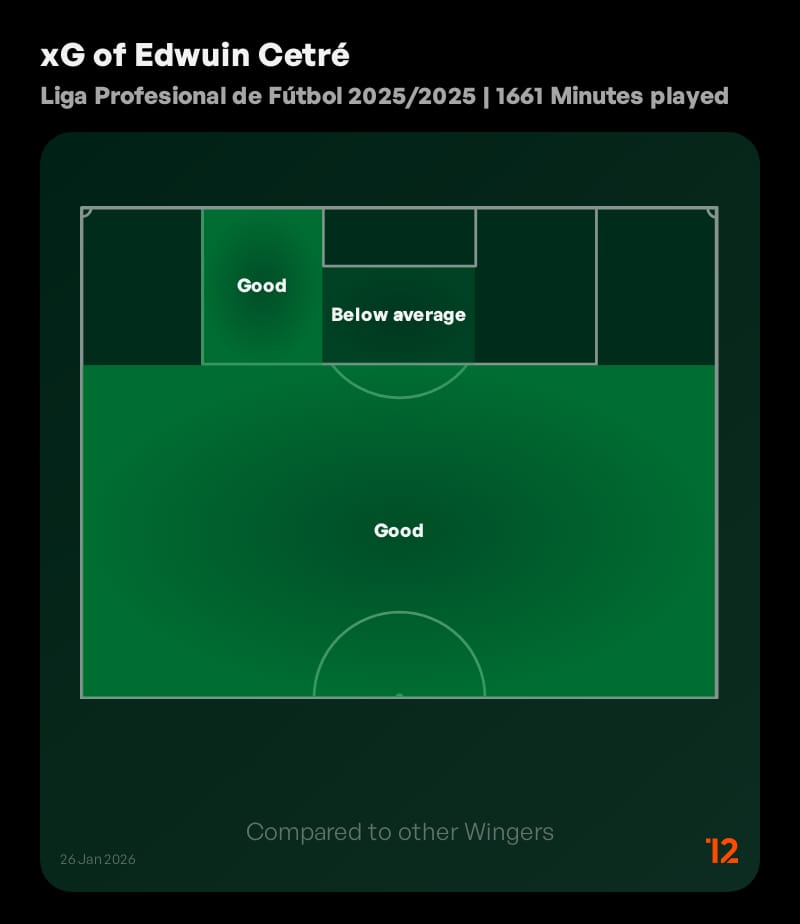 Cetré ofrecería otro perfil al ataque de Cruz Azul, pero hay dos dudas. Primero, con 28 años, el Colombiano no tiene mucho más tiempo en su edad pica, y la capacidad de un jugador en el 1vs1 ofensivo tiende de empeorar antes de otros conceptos. Además, Cetré frecuentemente tira de media distancia, y podría contribuir a la debilidad del ataque de Larcamón.