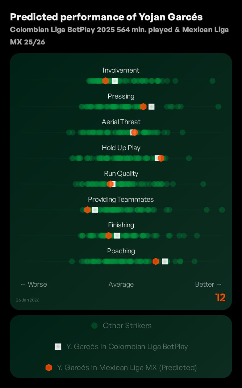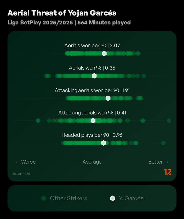 Sin embargo, Garcés ha mostrado el movimiento y la presencia para frecuentemente generar tiros desde adentro del área, 0.61 xG en 2025, más energía para presionar la construcción del rival.