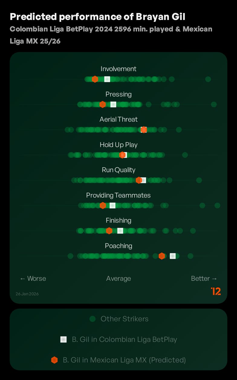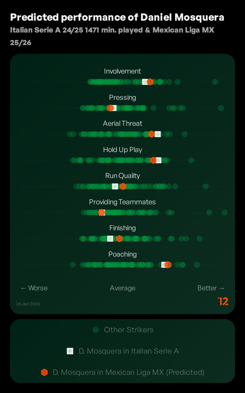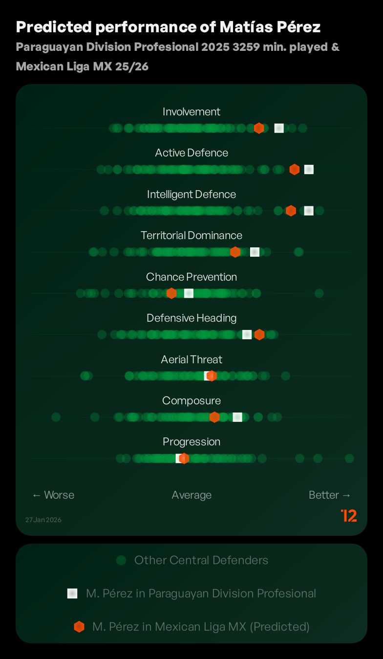 Análisis de conceptos de Pérez, desde Twelve. Con su modelo de adaptación, podemos ver un pronostico de su rendimiento en Liga MX, que toma en cuenta transferencias históricas y el impacto de cambiar la liga.