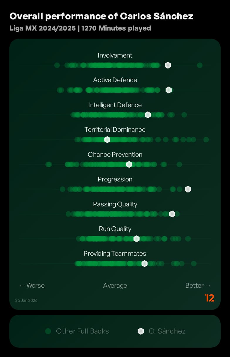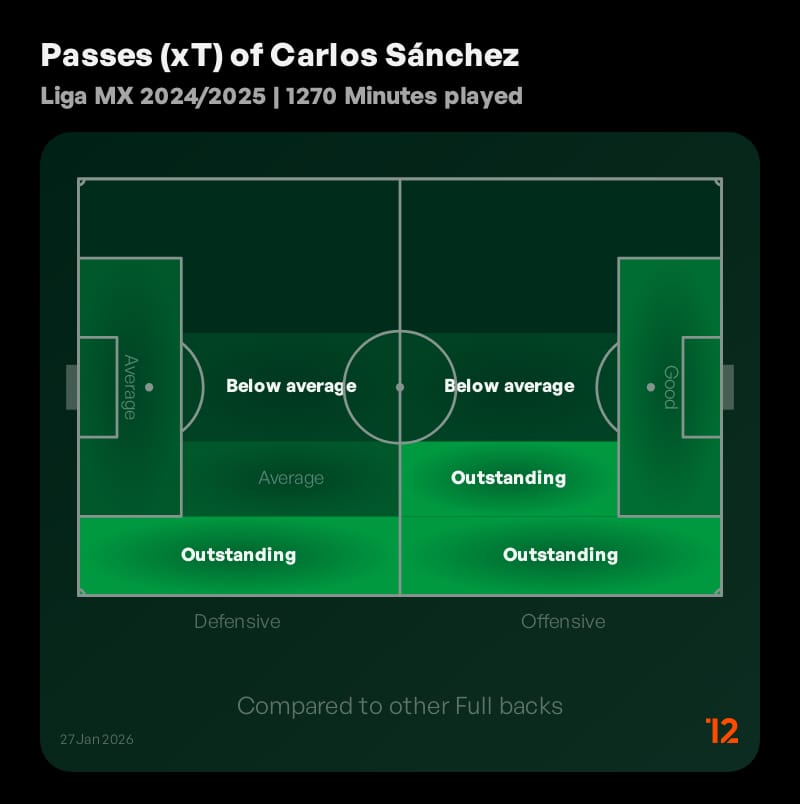 Carlos Adrián Sánchez es la opción destacada en Liga MX en este momento. Sánchez solo tiene 23 años, ha mostrado un gran nivel en el pasado, y no es un titular con Pachuca en este momento. Hay un riesgo en fichar un lateral tras jugar bajo Guillermo Almada, porque su estilo de juego siempre ha generado laterales con buenas métricas. Sin embargo, es un argumento a favor de Sánchez es que ya tiene experiencia en un sistema de presión alta.