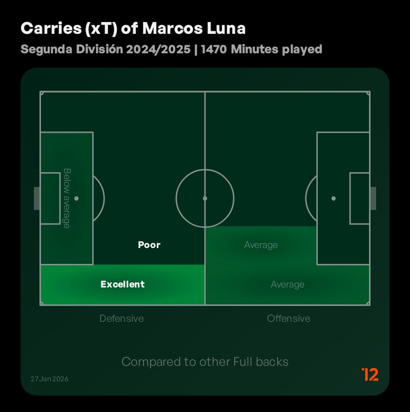 Marcos Luna, 22, solo ha sido titular en cinco partidos tras su llegada a Almería en el verano. Durante 2024-25, con Real Zaragoza, Luna mostró un buen perfil para un carrilero creativo, en un equipo de presión alta.